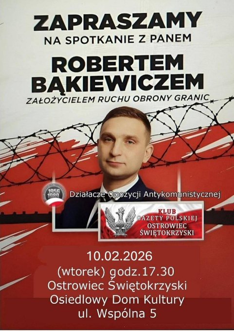 Ruch Obrony Granic, Klub Gazety Polskiej Ostrowiec Świętokrzyski oraz Działacze Opozycji Antykomunistycznej zapraszają na spotkanie z liderem ROG Robertem Bąkiewiczem. Spotkanie odbędzie się 10 lutego (we wtorek) o godzinie 17.30 w sali Osiedlowego Domu Kultury (ul. Wspólna 5).