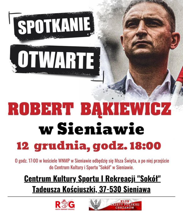 Już 12 grudnia o 18.00 odbędzie się spotkanie z liderem Ruchu Obrony Granic Robertem Bąkiewiczem w Centrum Kultury Sportu i Rekreacji „Sokół”, ul. Tadeusza Kościuszki, w Sieniawie.