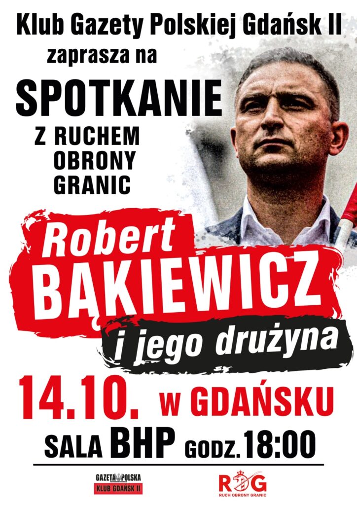 Klub Gazety Polskiej II w Gdańsku i Ruch Obrony Granic zapraszają 14 października o 18.00 na spotkanie z liderem Ruchu Obrony Granic Robertem Bąkiewiczem. Spotkanie odbędzie w sali BHP Stoczni Gdańskiej.