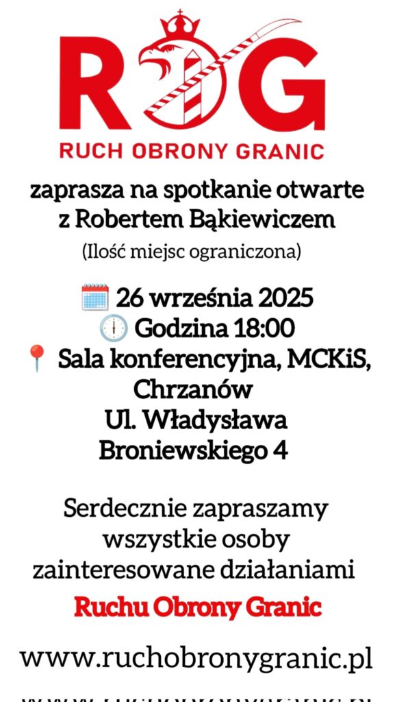Ruch Obrony Granic zaprasza na spotkanie otwarte z Robertem Bąkiewiczem, które odbędzie się 26 września 2025, o 18:00 w Chrzanów, w MCKiS, ul. Broniewskiego 4. Sala konferencyjna.