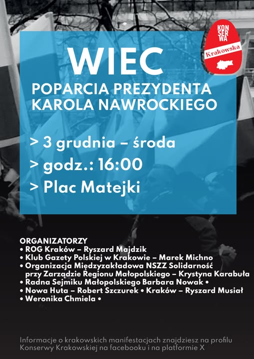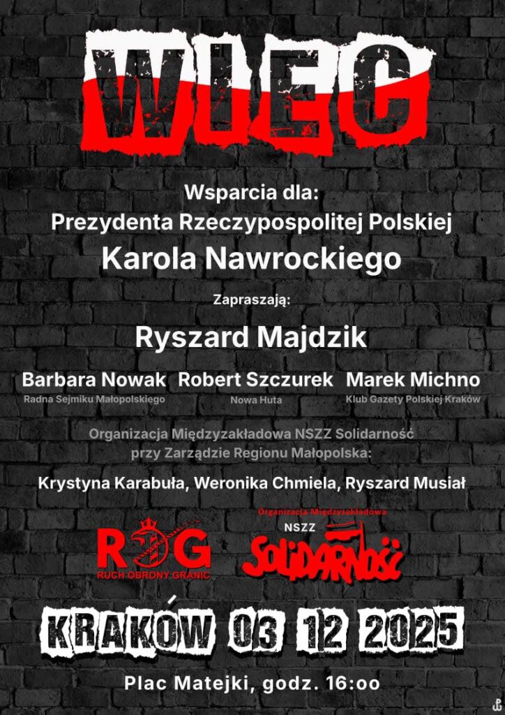 Ruch Obrony Granic, Klub Gazety Polskiej, NSZZ Solidarność i Krakowska Konserwa, zapraszają na wiec poparcia dla prezydenta Nawrockiego. Kraków, 3 grudnia, Plac Matejki, godzina 16.