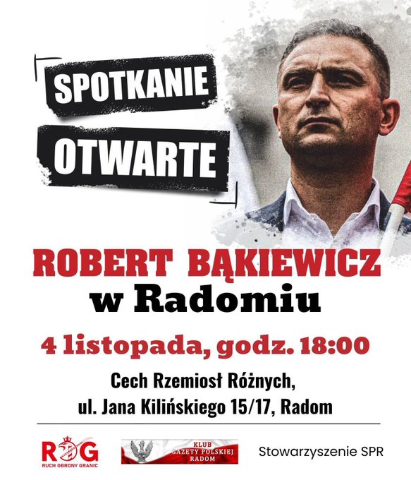 We wtorek, 4 listopada, o 18.00 w sali Cechu Rzemiosł Różnych (ul. Jana Kilińskiego 15/17) odbędzie się spotkanie z Robertem Bąkiewiczem. Spotkanie organizuje Ruch Obrony Granic i Klub Gazety Polskiej Radom.