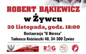 20 listopada odbędzie się spotkanie z liderem Ruchu Obrony Granic Robertem Bąkiewiczem w Żywcu. Spotkanie rozpocznie się 18.00 w restauracji u Meresa (Tadeusza Kościuszki 40).