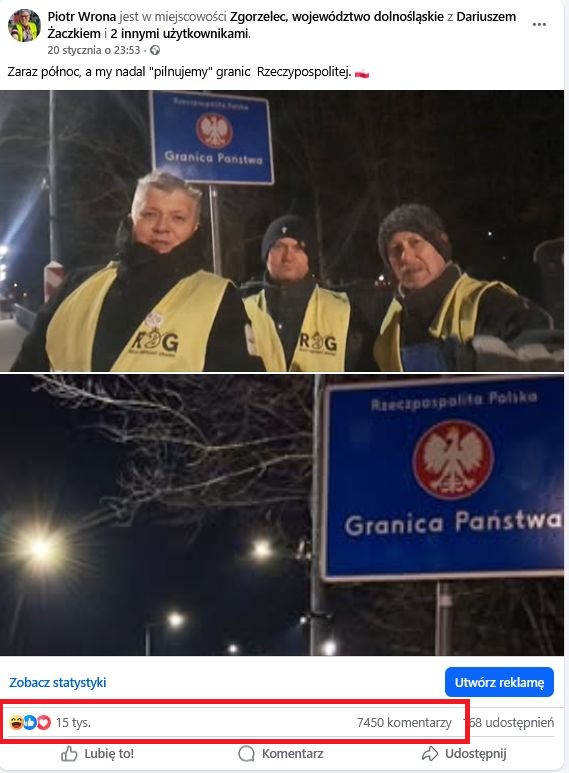W kolejnym wpisie Pior Wrona napisał, że zaobserwował „dziwny zbieg „okoliczności” gdy publikuję posty związane z Ruch Obrony Granic, jestem natychmiast blokowany, w tym miesiącu zdarzyło się to już 3 razy. Ostatnia, kilkudniowa blokada przytrafiła mi się prawdopodobnie po moim wpisie z granicy w Zgorzelcu, który osiągnął olbrzymi zasięg, ponad 658 tys. W tym czasie otrzymuję również olbrzymią ilość nieprzychylnych mi wiadomości, których część publikuję”.