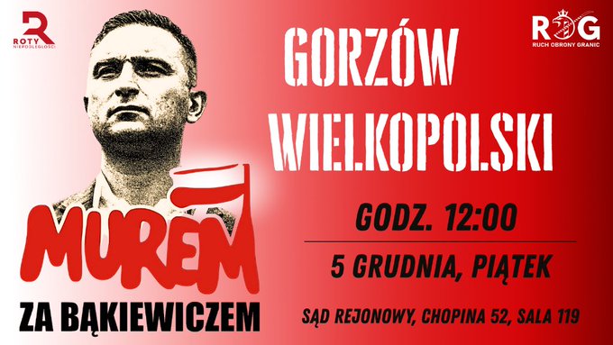 Ruch Obrony Granic poinformował, że „w piątek gorzowski Sąd Rejonowy pochyli się nad kuriozalnymi środkami zapobiegawczymi, które prokuratura Tuska nałożyła na Roberta Bąkiewicza”, w tym i nad zakazem „zbliżania się do” granicy Polski z Niemcami. W czasie posiedzenia sądu 5 grudnia, w piątek, o godzinie 12.00, przed Sądem Rejonowym w Gorzowie Wielkopolskim (ul. Chopina 52) […]