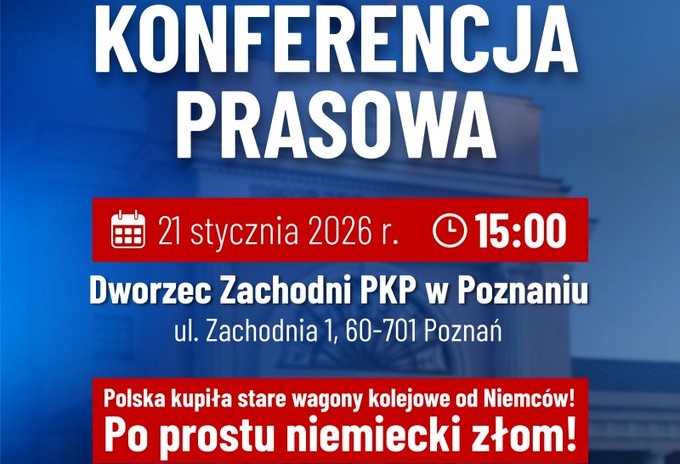 Robert Bąkiewicz zaprasza media na konferencję prasową dotyczącą zakupu przez polską kolej starych, wycofanych z użycia, wagonów kolejowych od Niemiec. Konferencja odbędzie się 21 stycznia 2026 w środę o 15.00, na Dworcu Zachodnim PKP w Poznaniu (ul. Zachodnia 1). Super Express w artykule „W Niemczech na złom, w Polsce na tory. Szokujące fakty o zdobyczach […]