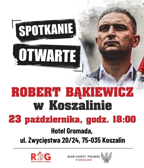 W czwartek, 23 października o 18.00 spotkanie z Robertem Bąkiewiczem w Koszalinie. Spotkanie ma się odbyć w Hotelu Gromada, ul. Zwycięstwa 20/24.