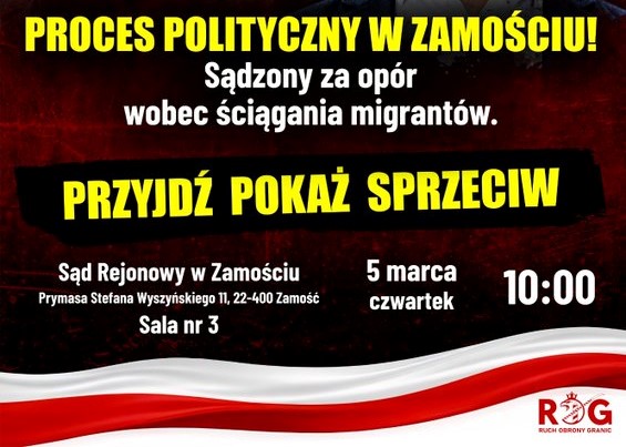 5 marca w czwartek, przed Sądem Rejonowy w Zamościu, ul. Prymasa Stefana Wyszyńskiego 11, o 10.00 rozpocznie się więc poparcia dla lidera Ruchu Obrony Granic Roberta Bąkiewicza. Wiec będzie trwał w czasie kolejnej odsłony procesu, jaki wytoczono liderowi ROG pod surrealistycznym zarzutem prowadzenie agitacji wyborczej w zamojskim ratuszu. Ta straszliwa zbrodnia, na której ściganie reżim […]
