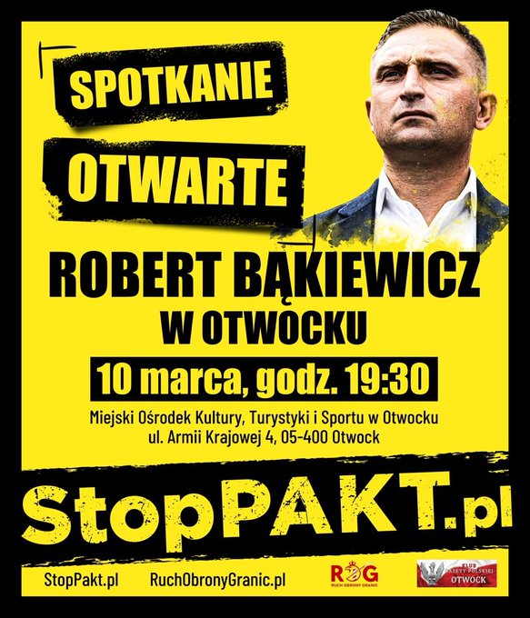 Dziś (10 marca, we wtorek) o 19:30 w Miejskim Ośrodku Kultury (ul. Armii Krajowej 4, Otwock) rozpocznie się spotkanie z Liderem Ruchu Obrony Granic Robertem Bąkiewiczem. Podczas spotkania będą zbierane podpisy pod społecznym projektem ustawy blokującej wprowadzenie Paktu Migracyjnego UE.