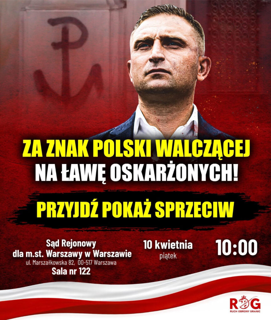 Dziś, 10 kwietnia, w piątek, o 10.00 rozpocznie się przed Sądem Rejonowy dla Warszawy (ul. Marszałkowska 82 | SALA: nr 122) kolejna odsłona procesu Roberta Bąkiewicza. Tym razem lider Ruchu Obrony Granic oskarżony jest o zbrodnie namalowania znaku Polski Walczącej.
