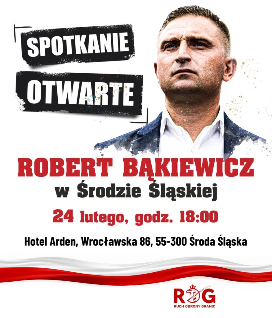 Dziś (we wtorek 24 lutego) w Środzie Śląskiej o godzinie 18.00 w Hotelu Arden, ulice Wrocławska 86, będzie miało miejsce spotkanie z: liderem Ruchu Obrony Granic Robertem Bąkiewiczem, aktywistą ROG i Klubów Gazety Polskiej Adamem Borowskim, ekspertem ROG konstytucjonalistą Oskarem Kidą i komentatorem telewizji Republika aktywistą ROG Jackiem Wroną.