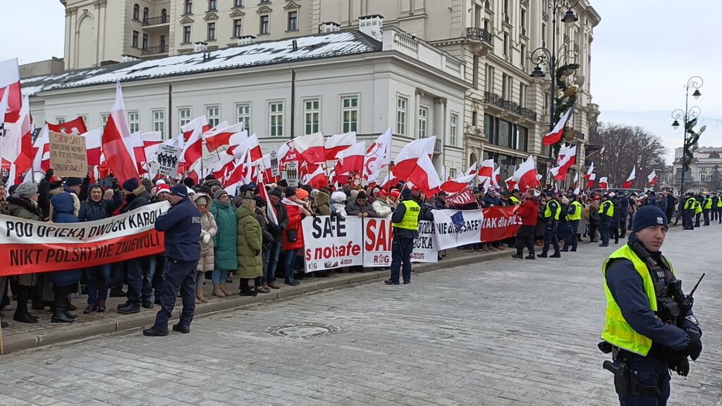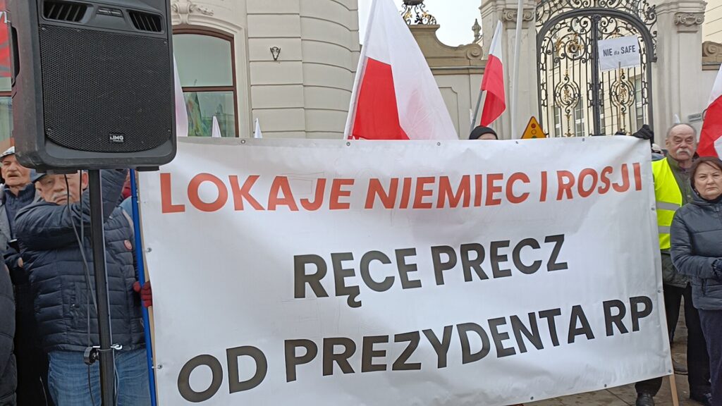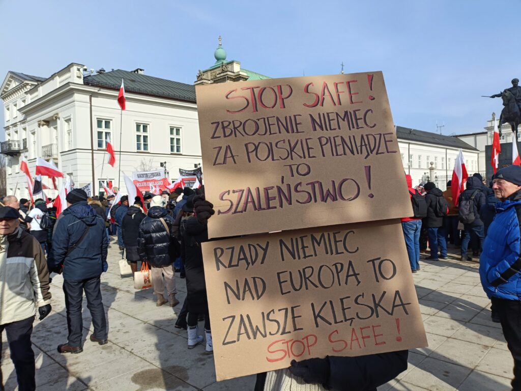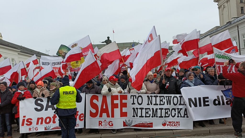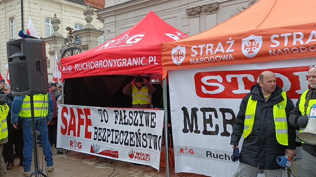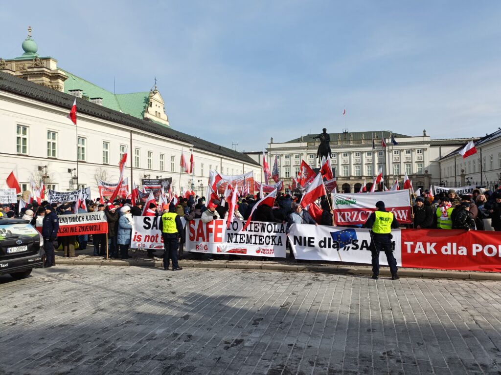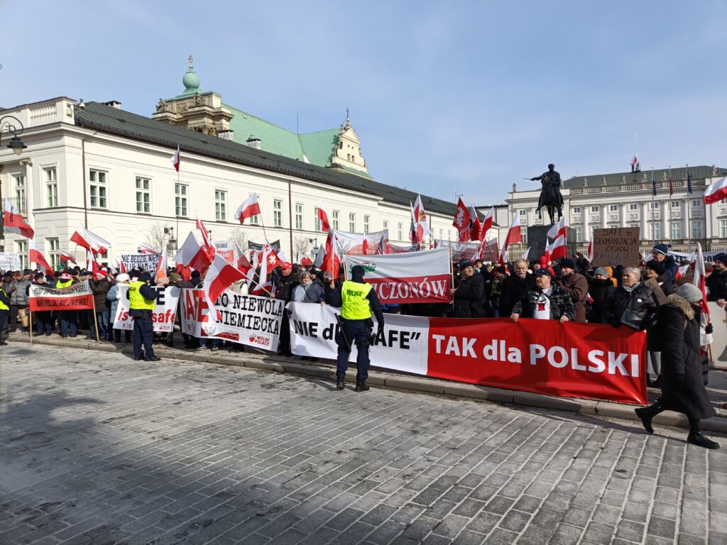 Przed Pałacem Prezydenckim odbył się więc przeciwko SAFE. Wiec zorganizował Ruch Obrony Granic, Kluby Gazety Polskiej i Wolni Polacy. Uczestnicy wiecu apelowali do prezydenta Nawrockiego o zawetowanie ustawy o SAFE. W swoich przemówieniach i rozmowach z prasą aktywiści ROG podkreślali, że SAFE to lichwiarska pożyczka, której oprocentowania nie znamy, którą będziemy musieli spłacać, choć możemy nie dostać kasy, oraz której celem jest pełne podporządkowanie Polski Unii Europejskiej będącej narzędziem niemieckiego kolonializmu.