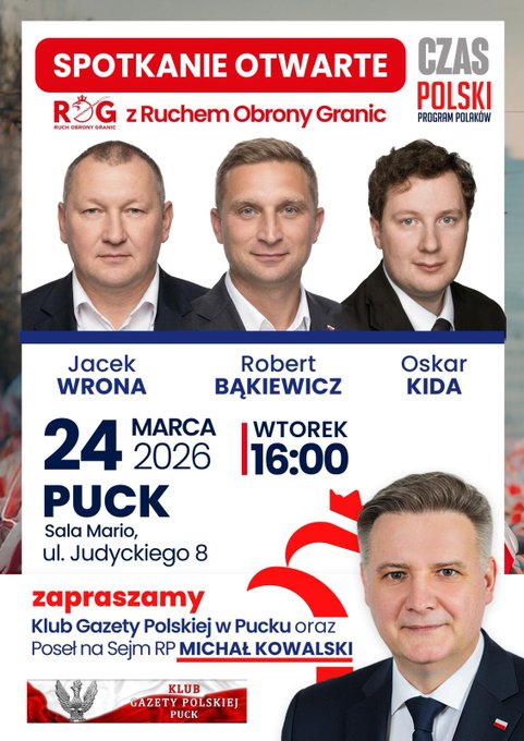24 marca 2026 (we wtorek), o godzinie 16.00, w Pucku, w Sali Mario, ul. Judyckiego 8, odbędzie się spotkanie z liderem Ruchu Obrony Granic Robertem Bąkiewiczem.