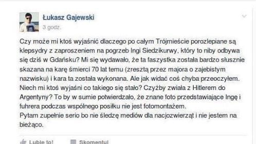 Nienawiść ideowej lewicy do Inki najlepiej obrazuje, opisany przez media, wpis działacza partii Zmiana Łukasza Gajewskiego – liderem Zmiany jest dzisiejszy kandydat z list Brauna Mateusz Piskorski, Jak można się dowiedzieć z artykułu na portalu „Republika” (Działacz partii Zmiana obraża „Inkę”. „To faszystka, która została słusznie skazana na śmierć”) „Łukasz Gajewski, działacz partii Zmiana, zamieścił w dniu pogrzebu „Inki” i „Zagończyka” obraźliwy wpis, dotyczący Danuty Siedzikówny”. W swoim wpisie działacz Zmiany napisał, że „po całym Trójmieście porozlepiane są klepsydry z zaproszeniem na pogrzeb Ingi Siedzik***wy” (w oryginale wulgaryzm na „k” nie był wykropkowany). Według działacza partii Zmiana Inka „ta faszystka została bardzo słusznie skazana na karę śmierci 70 lat temu”. Lewicowiec żartował, że pewnie Inka nie została zabita tylko „zwiała z Hitlerem do Argentyny”. W innym wpisie działacz Zmiany chwalił się, że podciera się klepsydrą z pogrzebu Inki.