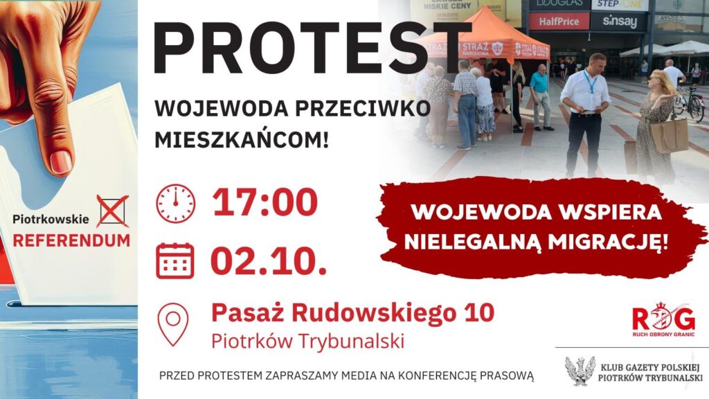 Robert Bąkiewicz na X poinformował, że 2 października, w czwartek, w Piotrkowie Trybunalskim o 17:00 przed Urząd Miasta (ul. Rudowskiego 10) aktywiści Ruchu Obrony Granic i Klubów Gazety Polskiej będą protestować przeciwko decyzji wojewody, który unieważnił lokalne antyimigracyjne referendum. Dla lidera ROG „to zamach na demokrację i policzek wymierzony mieszkańcom. Referendum to nasze prawo, a nie łaska władzy”. Przed protestem odbędzie się konferencja prasowa.